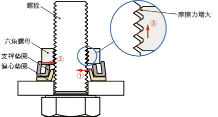 然后支撑垫圈顶起六角螺母,六角螺母和螺栓的摩擦力増大,从而防止松动。